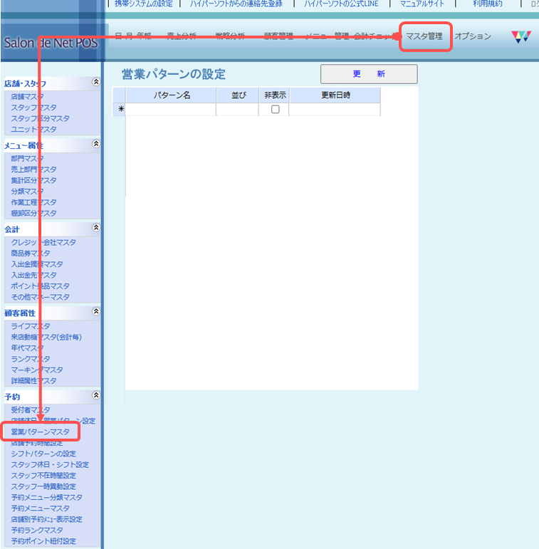 2 「マスタ管理」を開き、「営業パターンマスタ」を押下してください。