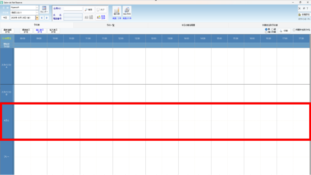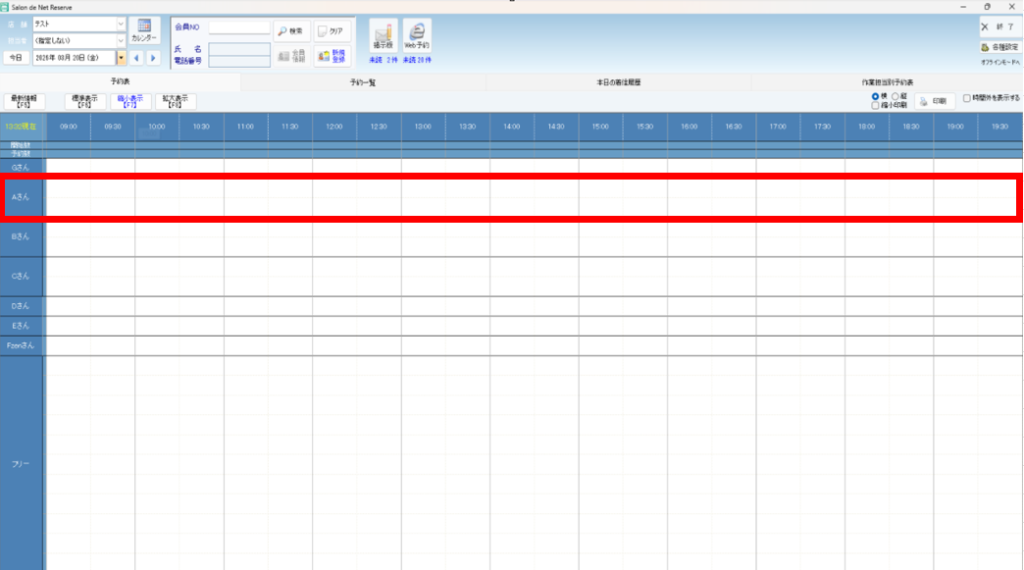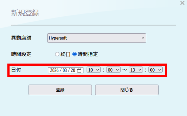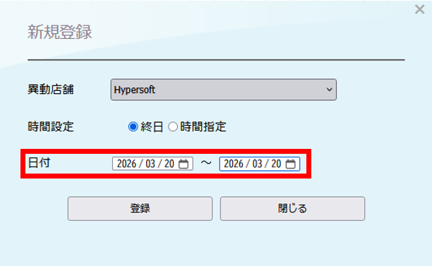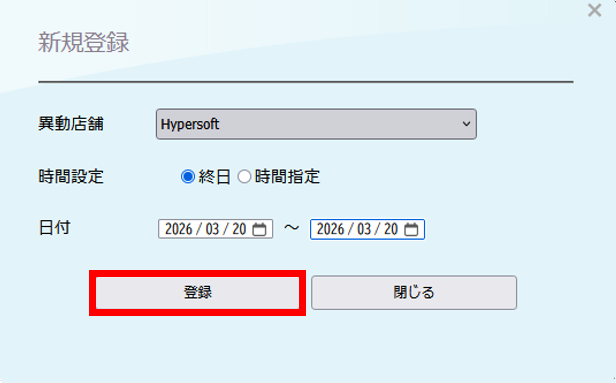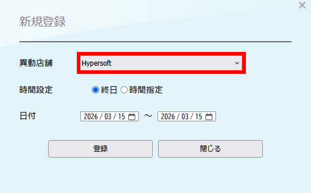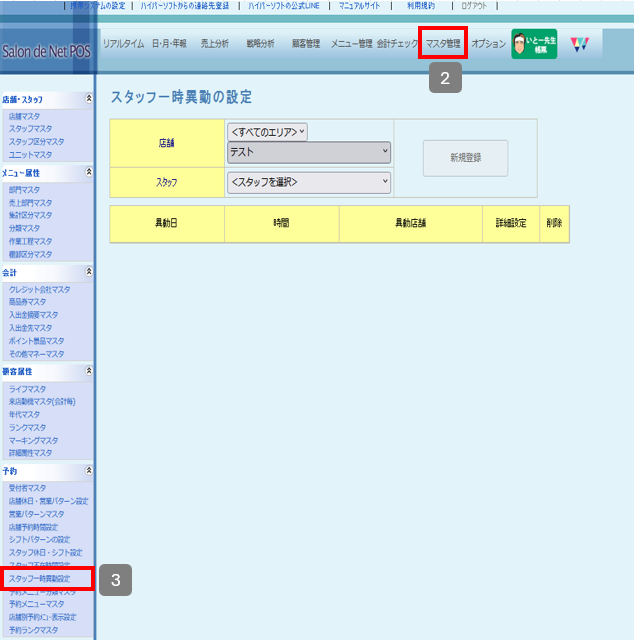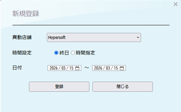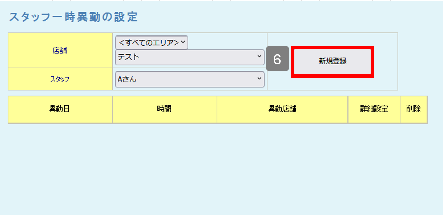 スタッフ一時異動設定 バックヤード 2026.03.152026.03.16 目次 一時的に他の店舗へ出勤する場合の設定について設定方法 一時的に他の店舗へ出勤する場合の設定について スタッフが一時的に他の店舗へ出勤される場合は、「スタッフ一時異動設定」をご利用いただきます。一時異動設定を行うと、異動期間内は異動先の店舗の予約表に予約列が表示され、予約を取得することが可能になります。 設定方法 1. バックヤードにログインしてください。 2. 画面上部に表示される『マスタ管理』をクリックします。3. 画面左側に表示される『スタッフ一時異動設定』をクリックします。 4. 一時異動させたいスタッフの所属店舗を選択します。 5. 一時異動させたいスタッフ名を選択します。 6. 新規登録を押します。 7. 新規登録画面が表示されます。 8. 異動店舗へ一時異動する先の店舗を設定します。 9. 異動日時の設定をします。 9-1 終日一時異動する場合は、終日を選択し、日付を設定します。 9-2. 時間で一時異動する場合、日時指定を選択し、日付と時間を設定します。 10. 情報の入力後は『登録』をクリックしてください。 11. 最後にReserve(予約表)を終了して、起動していただくと設定内容がReserveに反映されます。 ※予約表画面右上の『終了』を押して終了して起動し直してください。 ▼終日で一時異動を行った時の表示例 ▼時間指定で一時異動を行った時の表示例 ※グレーアウトしている時間に記載されているのは現在スタッフがいる店舗名になります。 BY>マスタ管理>店舗マスタで簡略店舗名を設定されている場合は、簡略店舗名が表示されます。