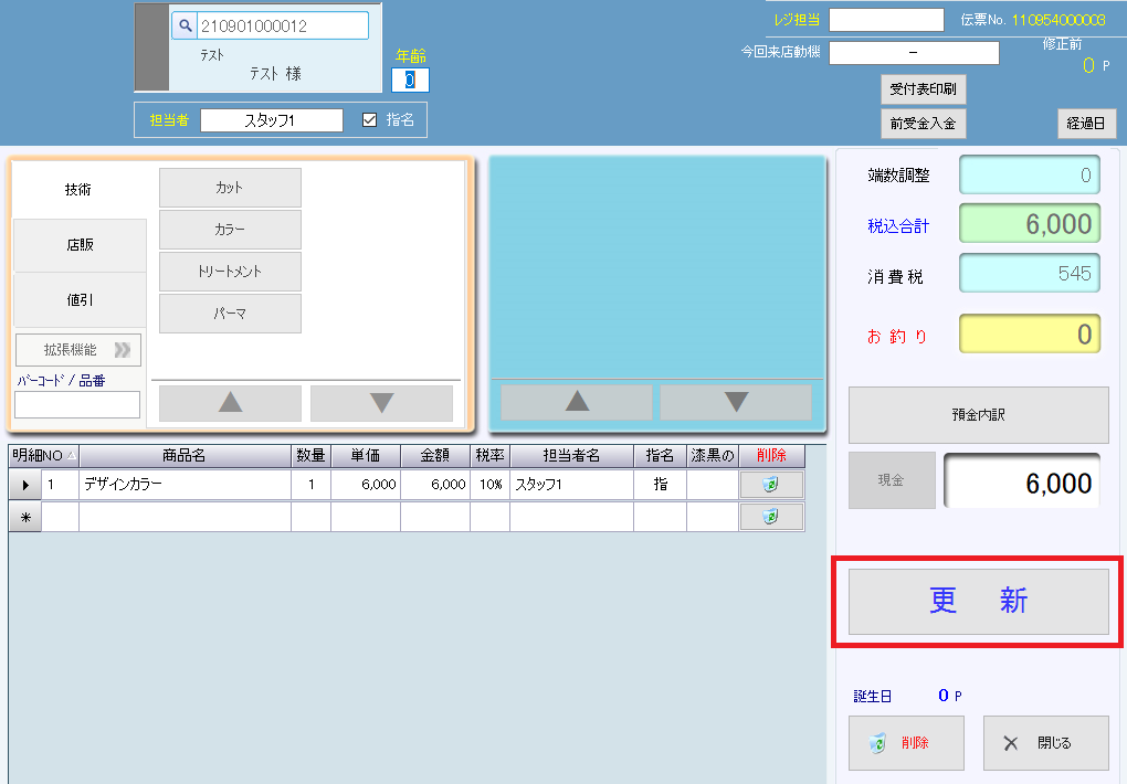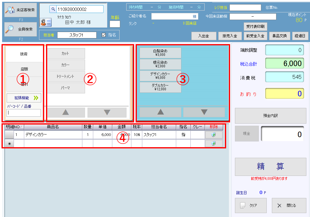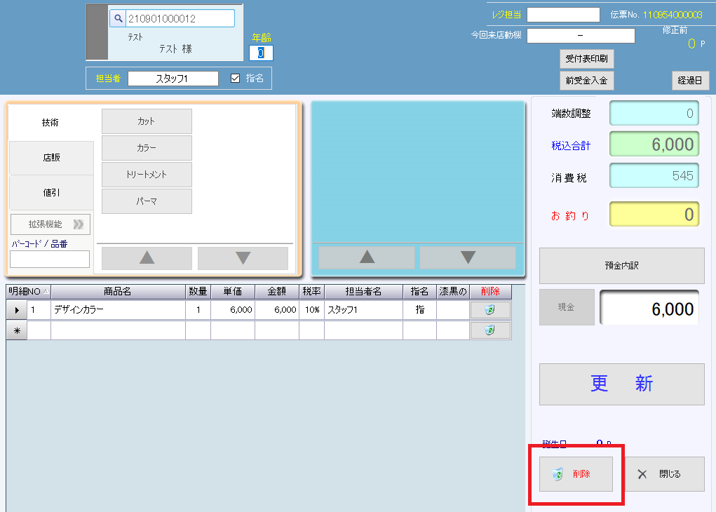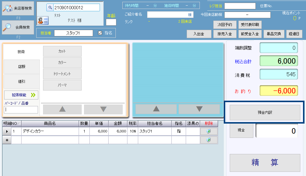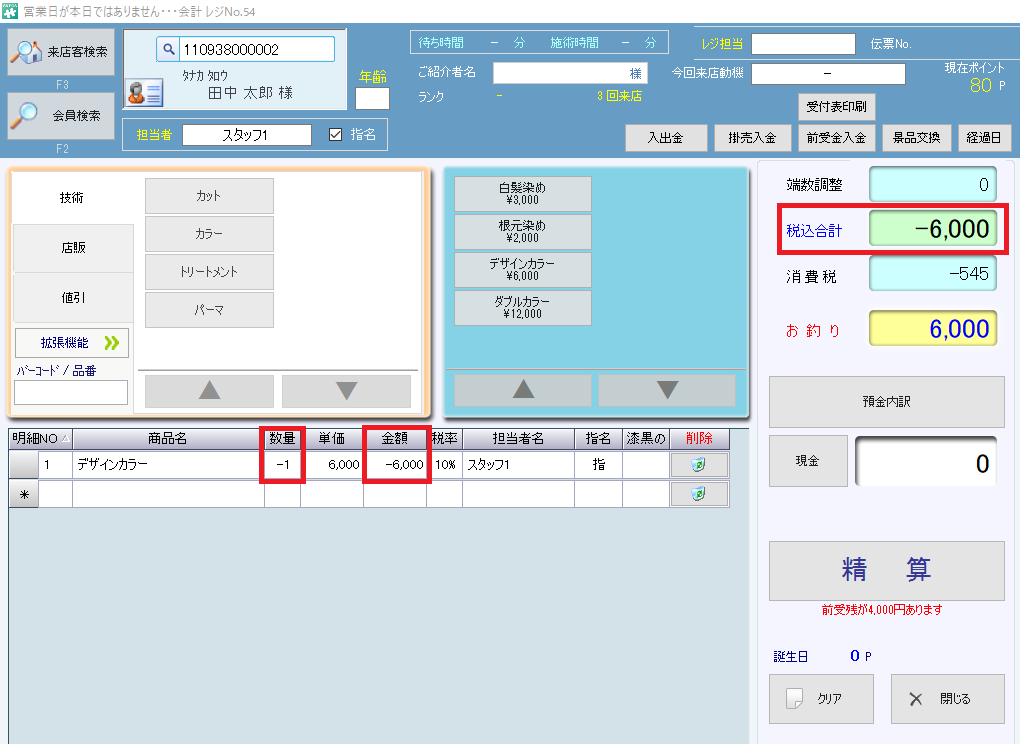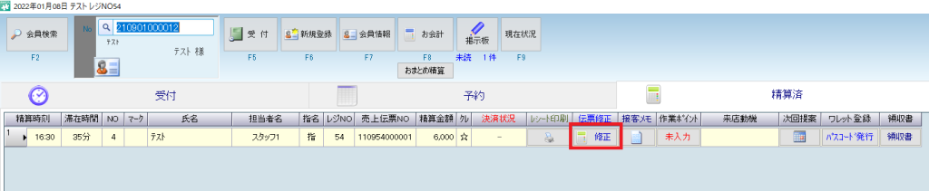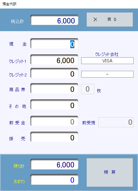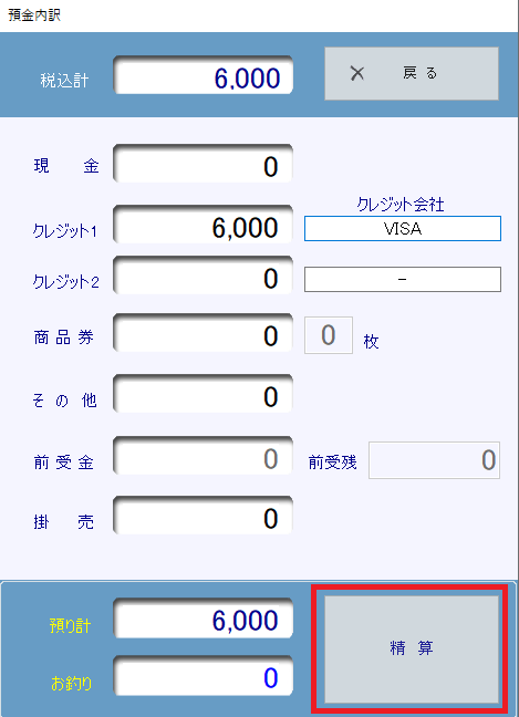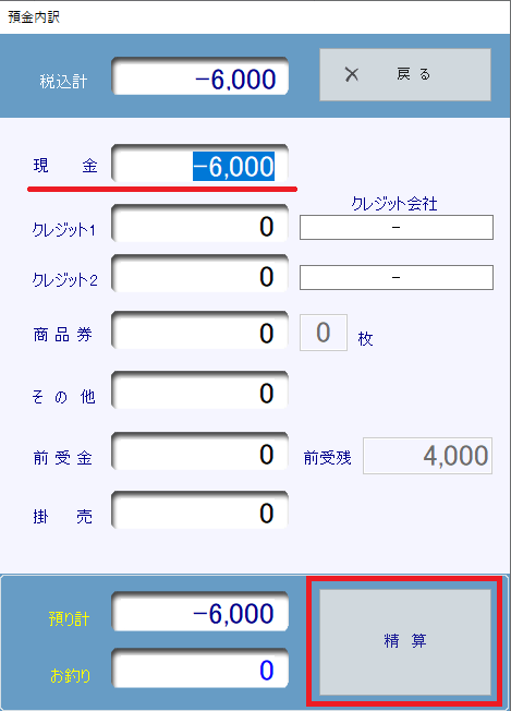 お会計・伝票修正・返金方法 POS 2021.11.152025.11.27 目次 お会計(精算)方法伝票修正・削除方法修正方法削除方法返金方法 お会計(精算)方法 1. 受付タブ内の『精算』をクリックし、お会計画面を開いてください。 2. メニューの選択やメニュー担当者の選択、指名あり・なし等を選択してください。①部門選択②分類選択③メニュー選択④メニュー明細 3. 『預金内訳』をクリックしてください。 4. 下図のような預金内訳画面が表示されたら、お預かりした金額を入力してください。 現金 お預かりした現金額を入力してください。 クレジット お支払いいただく金額を入力して、クレジット会社を選択してください。クレジットカードを2枚利用する場合は、クレジット2をご利用ください。 商品券 商品券欄をクリックすると登録済みの商品券が表示されます。お預かりした商品券の枚数を入力してください。 その他 その他欄をクリックすると登録済みの電子マネー等が表示されます。お支払いいただく金額を入力してください。 前受金 事前にお預かりしていたお金(前受金)がある場合は、前受残が表示されますので、前受残の中からご利用される金額を入力してください。 掛売 代金を掛け(後払い)とされる場合は、掛け金額を入力してください。 5. 最後に『精算』をクリックしてください。 伝票修正・削除方法 修正方法 1. 精算済タブに表示されている該当のお客様の『修正』をクリックしてください。 2. お会計画面が表示されますので、メニューや金額、担当者、指名等の変更後、『更新』をクリックしてください。 削除方法 伝票を削除したい場合は、『削除』をクリックしてください。 返金方法 返金対応が当日の場合 伝票修正・削除。 ※マイナス伝票の作成でも可能 返金対応が翌日以降の場合 マイナス伝票の作成を推奨しております。 伝票修正や削除でも対応可能ですが、その場合は伝票自体無かったことになりますのでお客様の会員情報にも返金した履歴が残りません。また、日をまたいで修正があった場合に、それぞれの日にちのレジ締めが合わなくなる可能性があります。そちらを回避するためのマイナス伝票の作成方法をご紹介します。 1. 返金対応しなければいけないお客様受付し、『精算』をクリックしてください。 2. お会計画面が開いたら、返金するメニューを選択し、『数量』の欄をクリックして「-1」と入力してください。 3. 現金で返金して、『精算』をクリックしてください。 上記のように入力することでお客様の来店履歴にも返金板履歴が残り、日をまたいだ返金対応でも、レジがずれることが無くなります。
