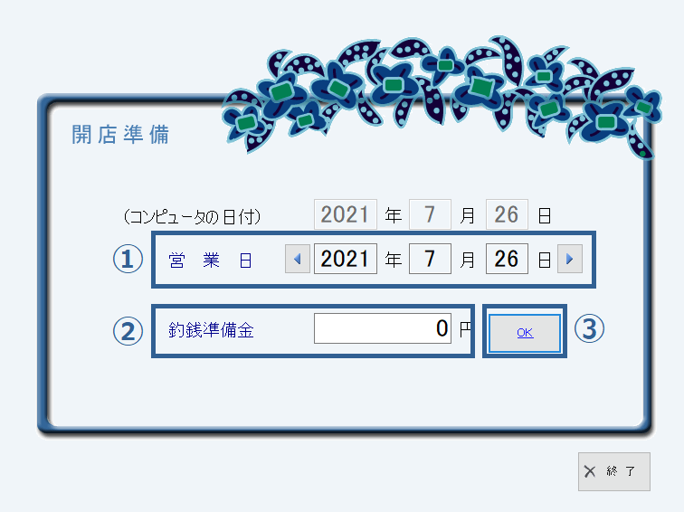 POSの起動・開店準備 POS 2022.01.082025.11.27 目次 POSの起動開店準備 POSの起動 デスクトップ画面上にある「SalondeNetPOS」と書かれているアイコンをダブルクリックしてください。 開店準備 ① 営業日の設定 営業日の日付を確認してください。基本的に当日の日付が表示されます。 左右の△ボタンで変更可能です。② 釣銭準備金の入力 当日の釣銭準備金額を入力してください。③ 開店準備OK ②までの作業が完了しましたら、OKボタンを押してください。