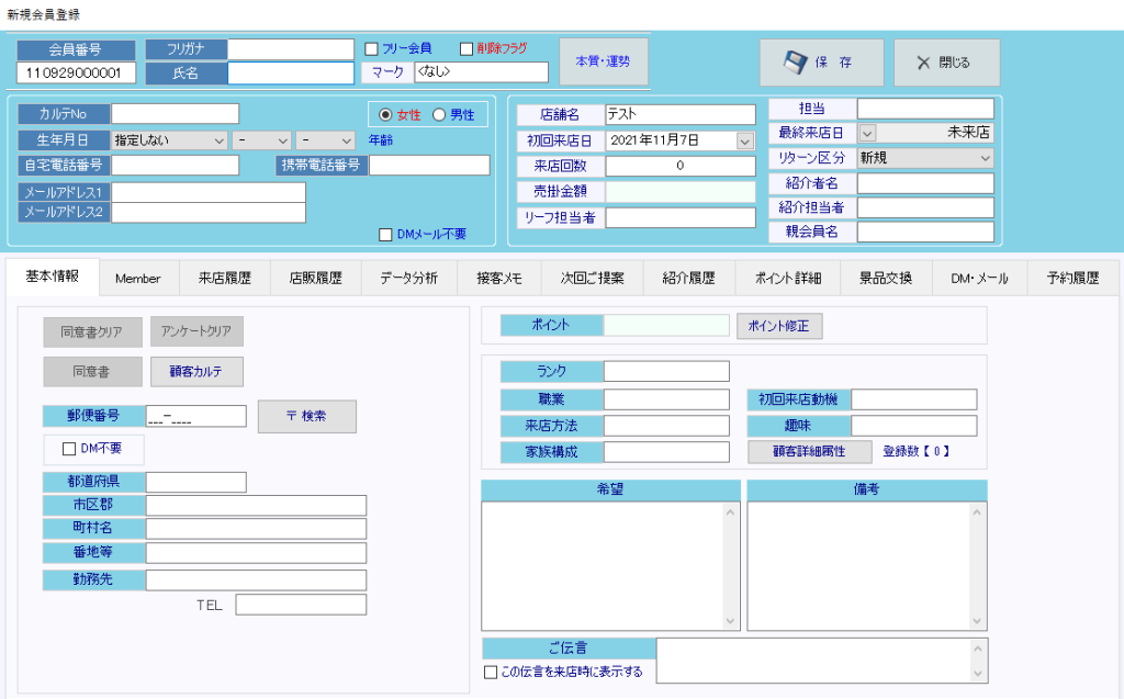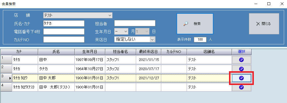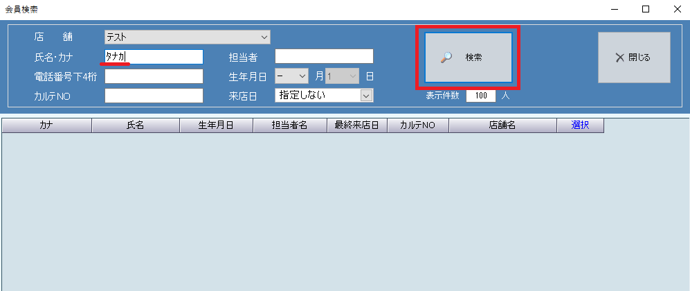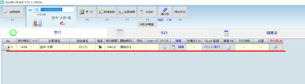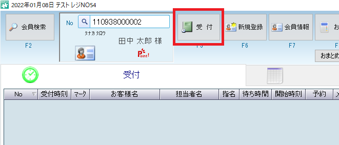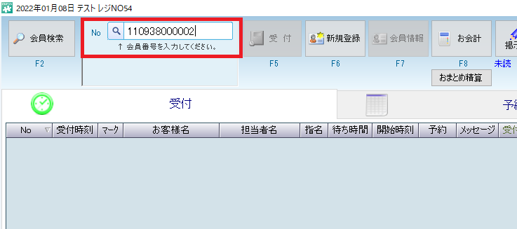 受付・会員の新規登録方法 POS 2022.01.082025.11.27 目次 受付方法会員検索から受付する方法会員番号で受付する方法会員の新規登録方法会員登録の際のポイント 受付方法 会員検索から受付する方法 1. 画面左上にある『会員検索』をクリックしてください。 2. 以下のような会員検索画面が表示されますので、氏名やカルテNo等で検索をかけてください。 3. 表示されたリストから該当の会員情報を選択してください。 4. 『受付』をクリックしてください。 5. 担当者を選択してください。 6. 受付されると該当のお客様のお名前が受付タブに表示されます。 会員番号で受付する方法 1. 検索ボックスに該当のお客様の「会員番号」を入力してEnterキーを押してください。 2. 検索ボックスの下に呼び出したお客様のお名前が表示されますので、『受付』をクリックしてください。 3. 担当者を選択してください。 4. 受付されると該当のお客様のお名前が受付タブに表示されます。 会員の新規登録方法 1. 新規のお客様がご来店された場合、『新規登録』をクリックしてください。 2. 以下のような新規会員登録画面が表示されますので、お客様の情報を入力して保存してください。 会員登録の際のポイント ①会員番号 会員番号は、設定により自動で番号が連番で登録できます。手動で番号を入力することも可能です。 ②フリー会員 フリー会員にチェックを入れると、いわゆる上様に近い扱いになり集計等にカウントされなくなります。 ③削除フラグ 削除フラグにチェックを入れると削除扱いになり検索にひっかからなくなります。 ④カルテNo 会員番号とは異なり、店舗で別に管理しているカルテの番号等を入力する項目です。こちらは手動のみの入力です。