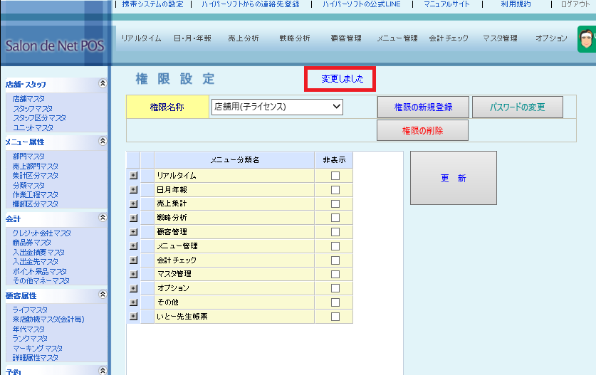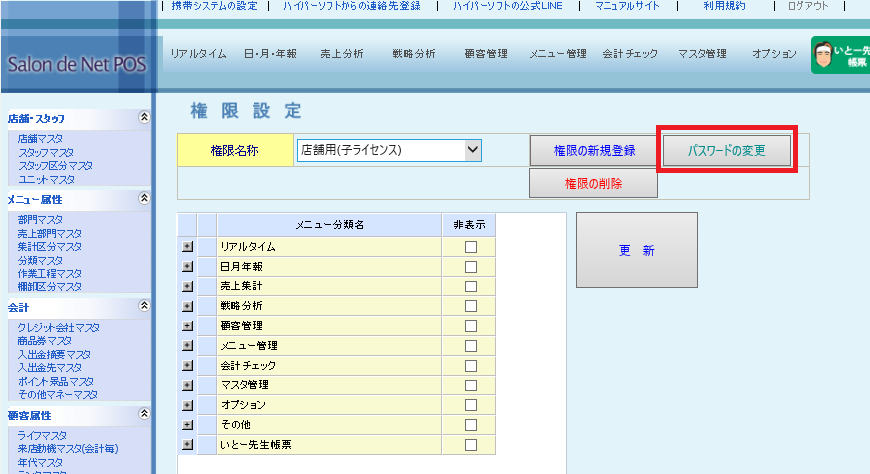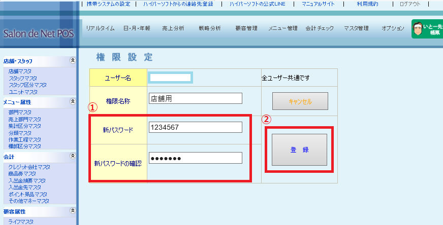 BYのパスワードを変更したい バックヤード 2022.01.092025.11.21 1. バックヤードにログインしてください。 2. 画面上部に表示される『マスタ管理』をクリックしてください。 3. 画面左側に表示される『権限設定』をクリックしてください。 ※表示がされない場合、子ライセンスでログインされていますので管理(親)ライセンスでログインし直していただくか、管理者の方へご相談をお願いします。 4. 『パスワードの変更』をクリックしてください。 5. ①「新パスワード」と「新パスワードの確認」に、新しいパスワードを入力してください。 ②『登録』をクリックしてください。 6. 「変更しました」という文字が表示されていればパスワードの変更完了です。 よくあるご質問 Q.「権限設定」が表示されない。A.「子ライセンス」でログインしている可能性があります。「権限設定」はすべてが確認できる管理(親)ライセンスでしか設定できませんのでご注意ください。 例) バックヤードのライセンス 権限設定 ユーザー名 パスワード 管理ライセンス(親ライセンス) Hypersoft 12345678 可能 店長用(子ライセンス) Hypersoft 1234 不可能(表示されません) スタッフ用(子ライセンス) Hypersoft 0000 不可能(表示されません) ※1つのユーザー名に対して、パスワードの異なる子ライセンスを作成できるようになっておりますが、権限設定ができるのは管理ライセンスのみになります。 ※「ユーザー名:Hypersoft」に対する権限設定を行いたい場合は、「ユーザー名:Hypersoft」の管理ライセンスでログインしていただく必要があります。別のユーザー名(管理ライセンス)から「ユーザー名:Hypersoft」の権限設定は行えません。