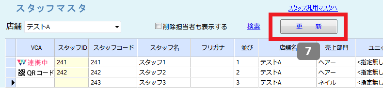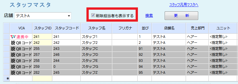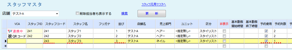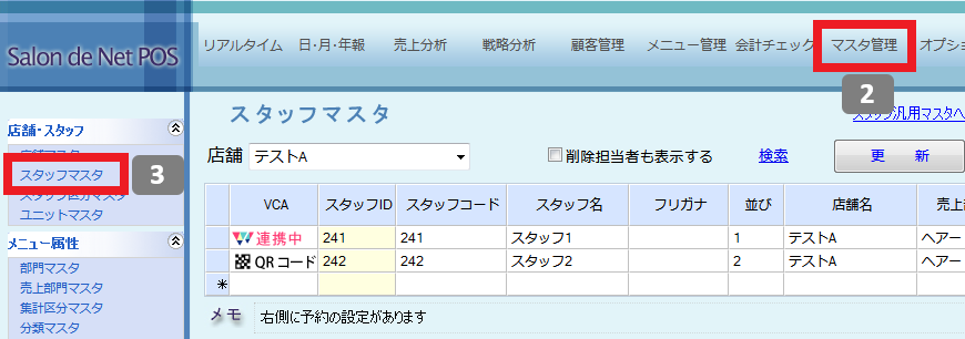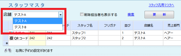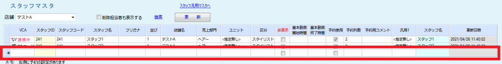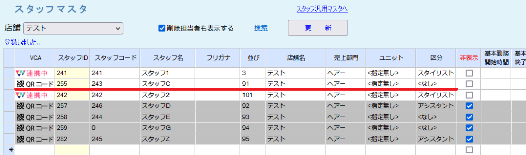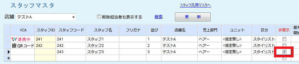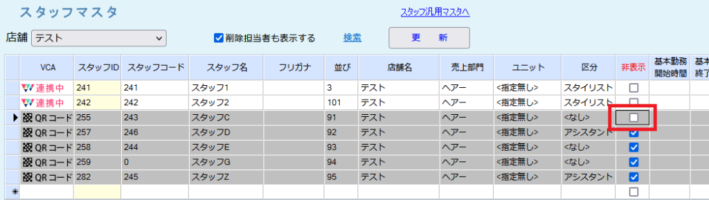スタッフの登録・非表示設定 バックヤード 2022.01.092025.11.22 目次 スタッフの登録・非表示設定スタッフの非表示解除方法 スタッフの登録・非表示設定 1. バックヤードにログインしてください。 2. 画面上部に表示される『マスタ管理』をクリックしてください。3. 画面左側に表示される『スタッフマスタ』をクリックしてください。 4. 複数店舗ある場合は、店舗欄をクリックしていただくことで店舗の切り替えが可能です。 5. スタッフを登録する場合は、一番下の※がついた枠に登録します。 6. 「スタッフ名」「フリガナ」「並び」などを入力してください。タイムカード機能をご利用いただく場合は、「スタッフコード」も入力してください。予約システムをご利用いただく場合は、「予約使用」にチェックを入れ、「予約列数」に列数を入力してください。 スタッフを非表示にしたい場合は、『非表示』にチェックを入れてください。 7. 情報の入力後は、『更新』をクリックしてください。 8. 最後にシステムを終了して、起動しなおしてください。 スタッフの非表示解除方法 1. 『削除担当者も表示する』にチェックを入れると、現在非表示になっているスタッフマスタが表示されます。(背景色がグレーのもの) 2. 再表示させたいスタッフマスタの非表示のチェックを外して、「更新」をクリックしてください。 非表示を解除したスタッフが再表示されます。