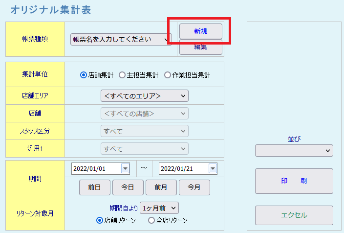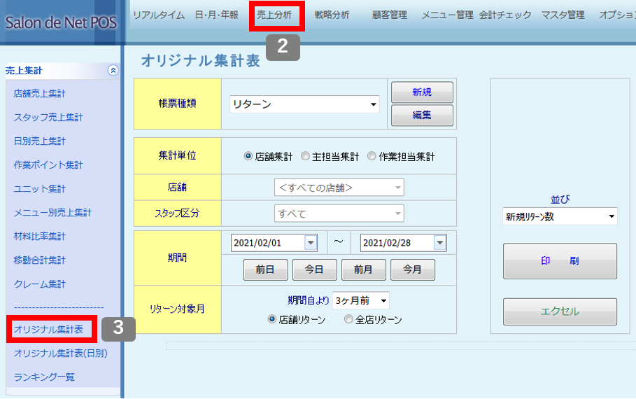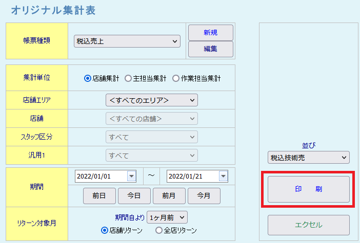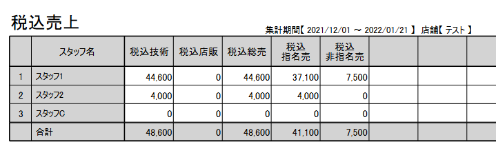 税込の売上金額を確認したい バックヤード 2022.01.102025.11.22 1. バックヤードにログインしてください。 2. 画面上部に表示される『売上分析』をクリックしてください。3. 画面左側に表示される『オリジナル集計表』をクリックしてください。 ※「オリジナル集計表」は、お客様で帳票の項目を指定いただく必要があります。 4. 『新規』をクリックして帳票を作成します。 5. 帳票項目の登録画面が表示されますので、『分類』から「売上」を選択してください。『表示項目名』からは「税込〇〇」と書かれた項目を選択してください。 6. 『オリジナル帳票名』の入力後、『登録』ボタンをクリックしてください。 7. 帳票種類、集計単位、店舗、スタイリスト、期間などを指定して、『印刷』ボタンをクリックしてください。 印刷ボタンをクリックすると以下のような帳票が表示されます。