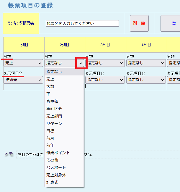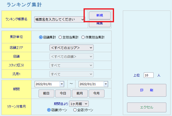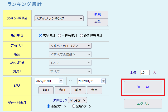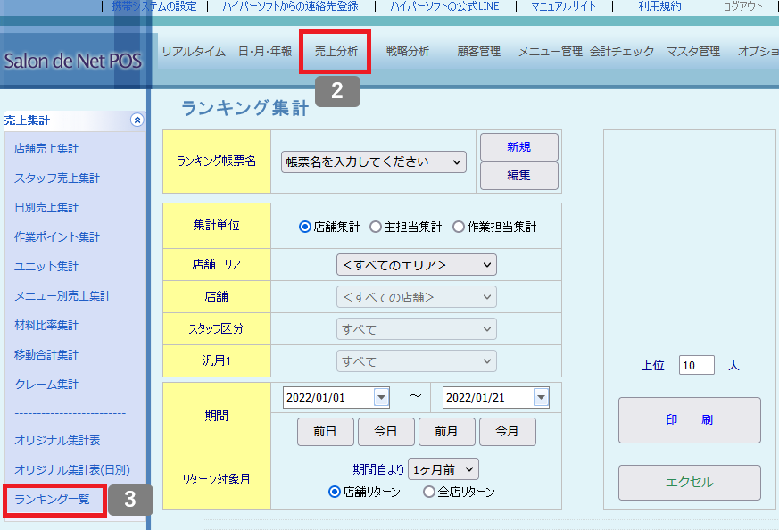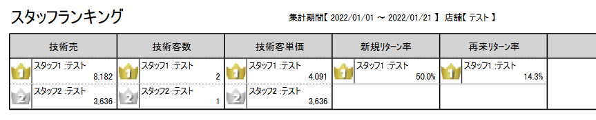 スタッフのランキングを出したい バックヤード 2022.01.102025.11.22 1. バックヤードにログインしてください。 2. 画面上部に表示される『売上分析』をクリックしてください。3. 画面左側に表示される『ランキング一覧』をクリックしてください。 ※「ランキング集計表」は、お客様で帳票の項目を指定いただく必要があります。 4. 『新規』をクリックして帳票を作成します。 5. 分類の▼をクリックして分類選択後、表示項目名の▼をクリックして表示項目を選択してください。 6. 『ランキング帳票名』の入力後、『登録』をクリックしてください。 7. 帳票種類、集計単位、店舗、スタイリスト、期間などを指定して、『印刷』ボタンをクリックしてください。 印刷をクリックすると以下のような帳票が表示されます。