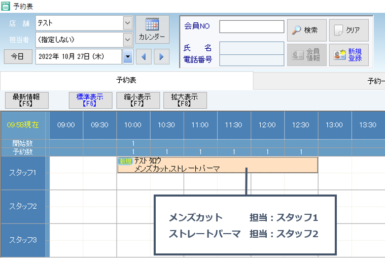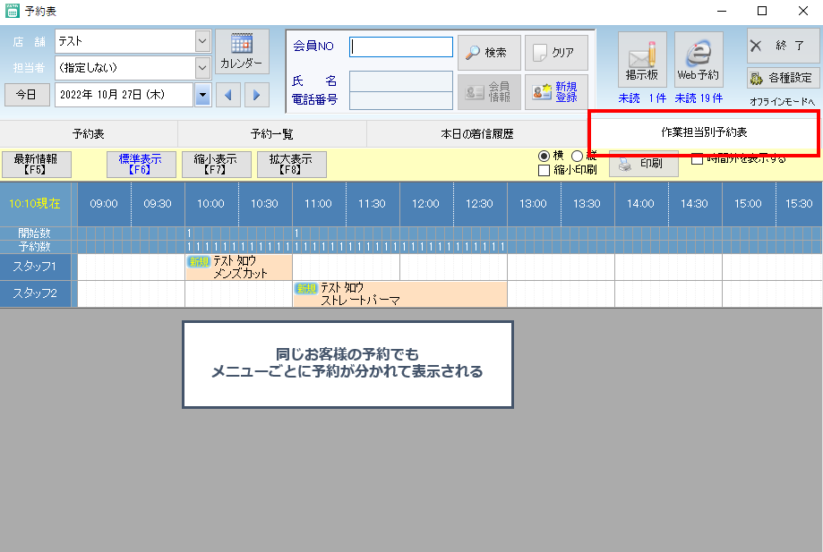 作業担当別予約表について Reserve 2022.02.102025.11.25 「予約表」タブではお客様ごとの予約状況が表示されます。 「作業担当別予約表」タブでは作業担当(メニュー)ごとの予約状況が確認できます。