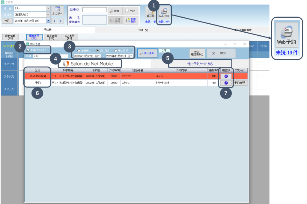 Salon de Net Mobileから入ってきた予約が表示されます。