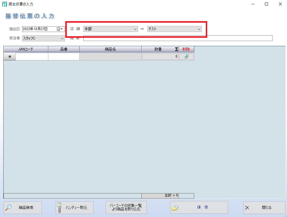 本部で仕入れた商品を店舗に分配したり、店舗在庫を他店舗や本部に移動する場合に行う処理です。
