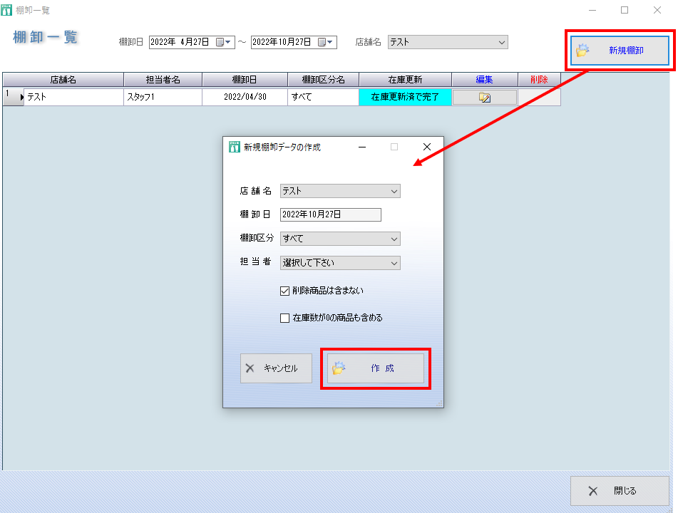 ⒉ 「新規棚卸」を押下して、新規棚卸データの作成を行ってください。