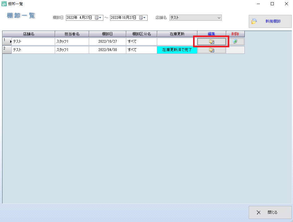 ⒊ 棚卸一覧から作成した棚卸の「編集」を押下してください。