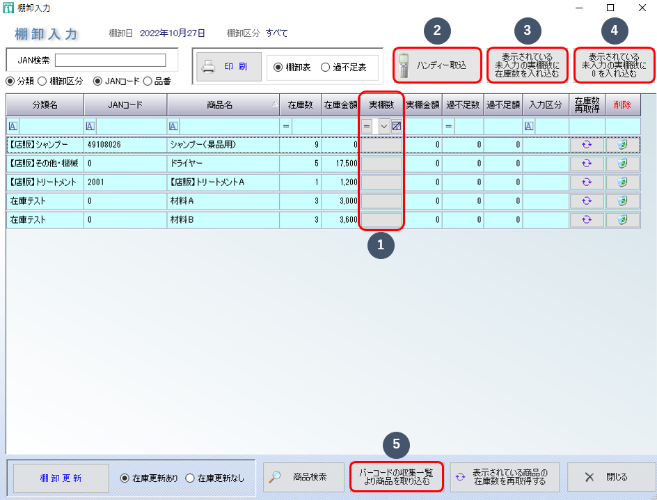 ⑤商品バーコードの収集で収集した商品の数量を実棚数に入力します。