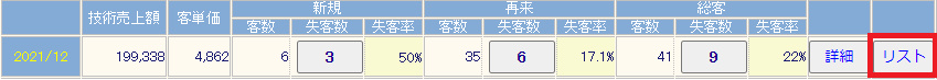 2021年12月に来店されたすべてのお客様(総客)は「41人」。そのうち集計ボタンを押下した時点までに再来店が無かった方は「9人(失客数)」なので、失客率は「22%」。
