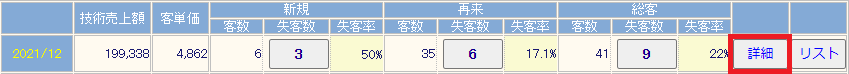 2021年12月に新規で来店されたお客様が「6人」。そのうち集計ボタンを押下した時点までに再来店が無かった方は「3人(失客数)」なので、失客率は「50%」となります。