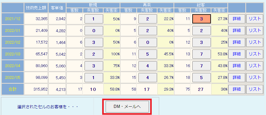 表内の「失客数」の数字の部分を押下すると数字の部分が赤くなり、その状態で画面下の方にある「DM・メールへ」を押下すると条件検索のDM送付画面に遷移します。そちらから失客してしまったお客様へDMやメールを送信していただくことが可能です。