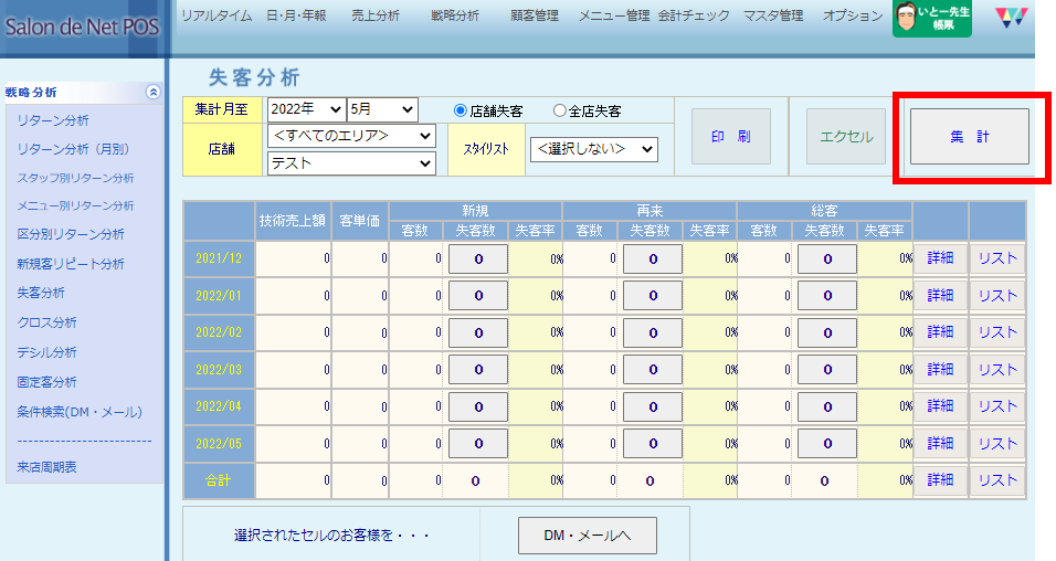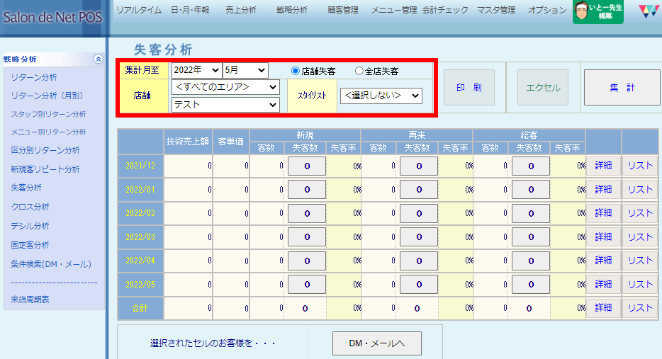 失客分析では、指定した月に来店されたお客様が、集計をかけた時点でどれだけ再来店していないか、を調べることができます。