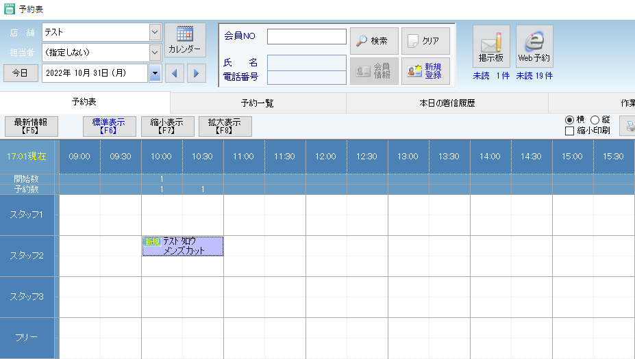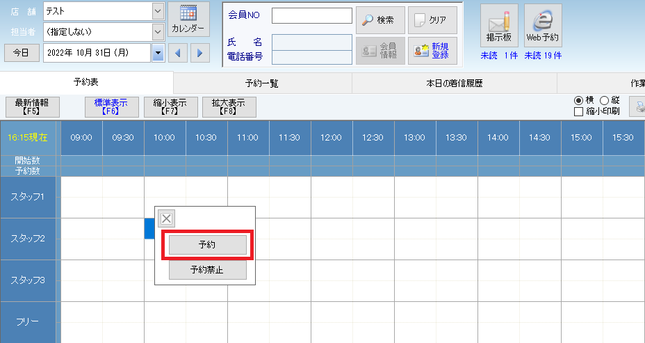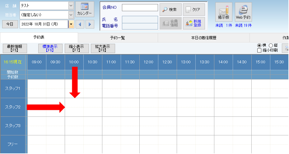 1. 予約表画面でお客様の希望日時、担当者のマスをクリックしてください。