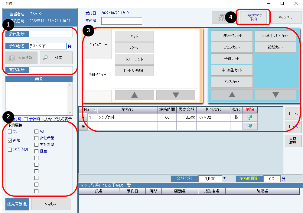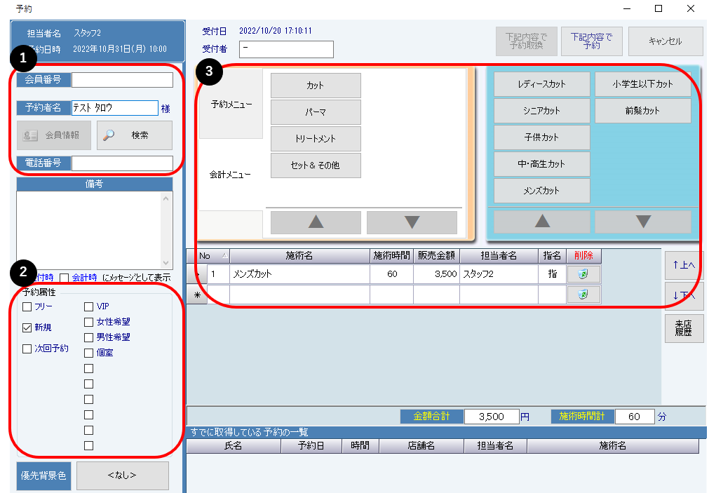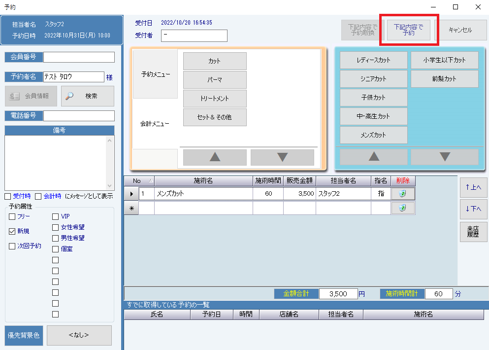 予約メニュー:予約用の大まかなメニューで、実際のお会計には反映されません。