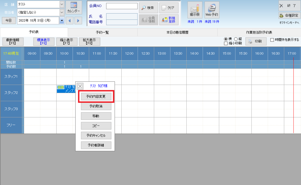 1. 既に入力してある予約を押下し、表示されたメニューから「予約内容変更」を選択してください。
