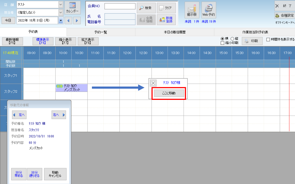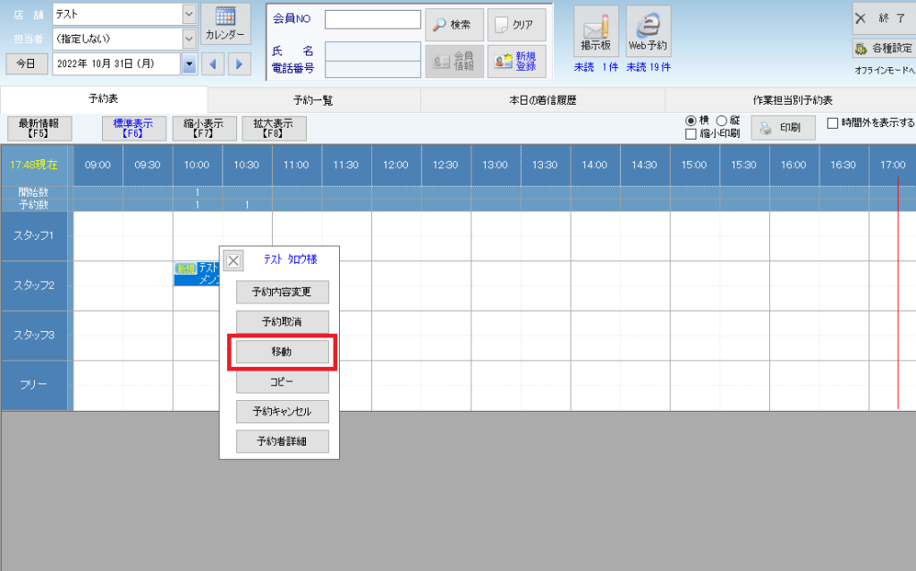 1. 移動させたい予約を押下し、表示されたメニューから「移動」を選択してください。