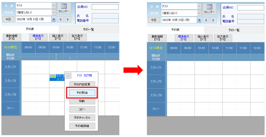 予約キャンセルは予約表上から予約は消えず、色が変わります。