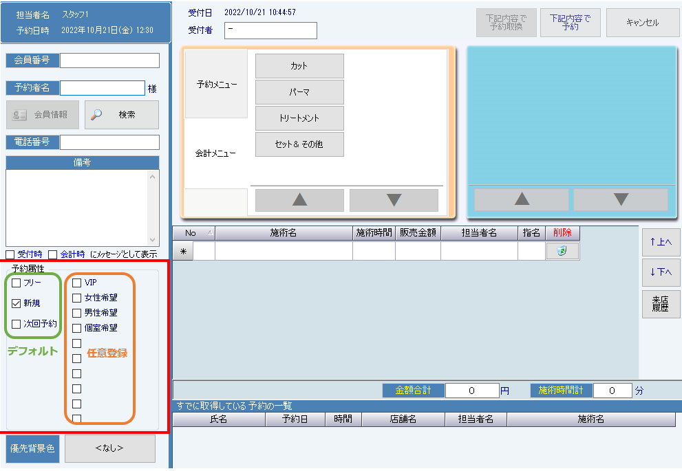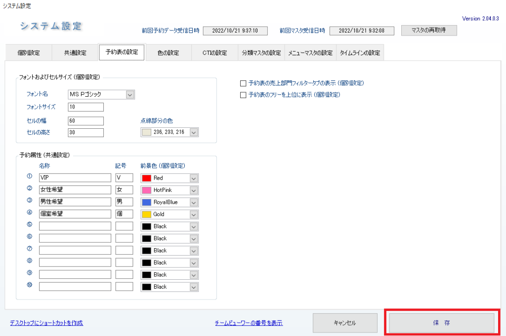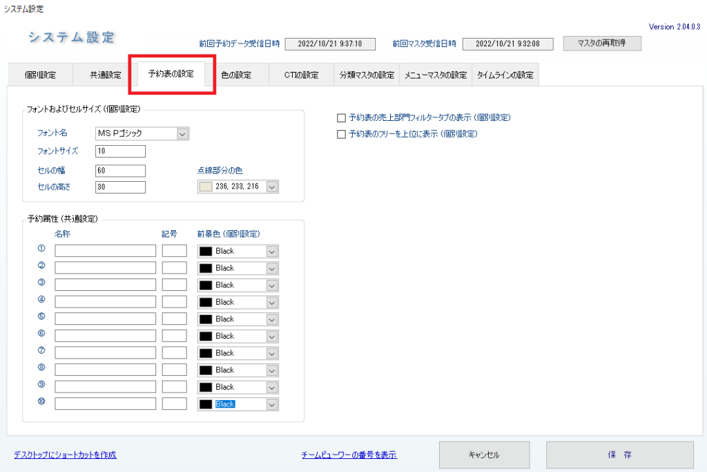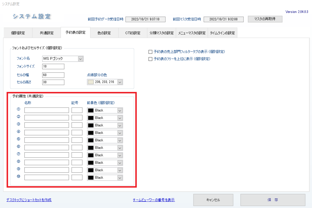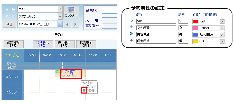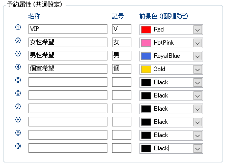 ・任意で追加できる10項目の予約属性は、該当の予約属性が選択されている場合に、予約表上で文字色が設定色に変わります。