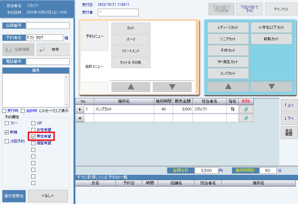 予約内容入力画面で予約に対して該当する予約属性があればチェックを入れてください。