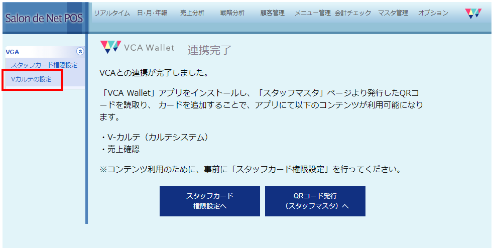 3. 画面左側に表示される「Vカルテの設定」を押下してください。