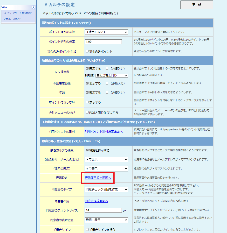 4. 「顧客カルテ登録の設定(Vkarute Plus・Pro)」内の「表示項目設定画面へ」を押下してください。