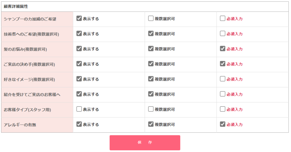 6. 下にスクロールすると登録済みの顧客詳細属性が表示されるので、表示させたい項目の「表示する」にチェックを入れてください。必要に応じて「複数選択可」「必須入力」にもチェックを入れて、「保存」を押下してください。