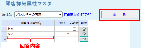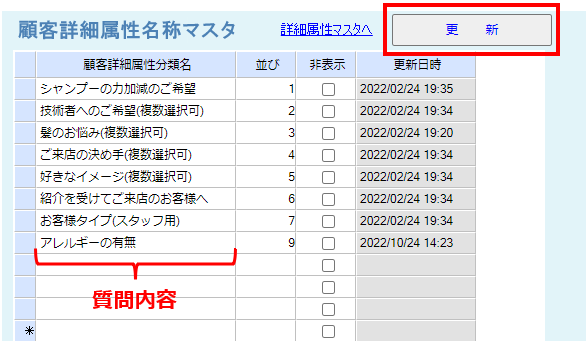 5. 「顧客詳細属性分類名」の欄に質問内容を入力して、「更新」を押下してください。