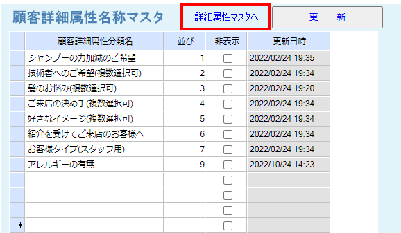 4. カウンセリングの質問内容は「詳細属性名称マスタ」に登録しますので、青い文字の「詳細属性名称マスタへ」を押下してください。