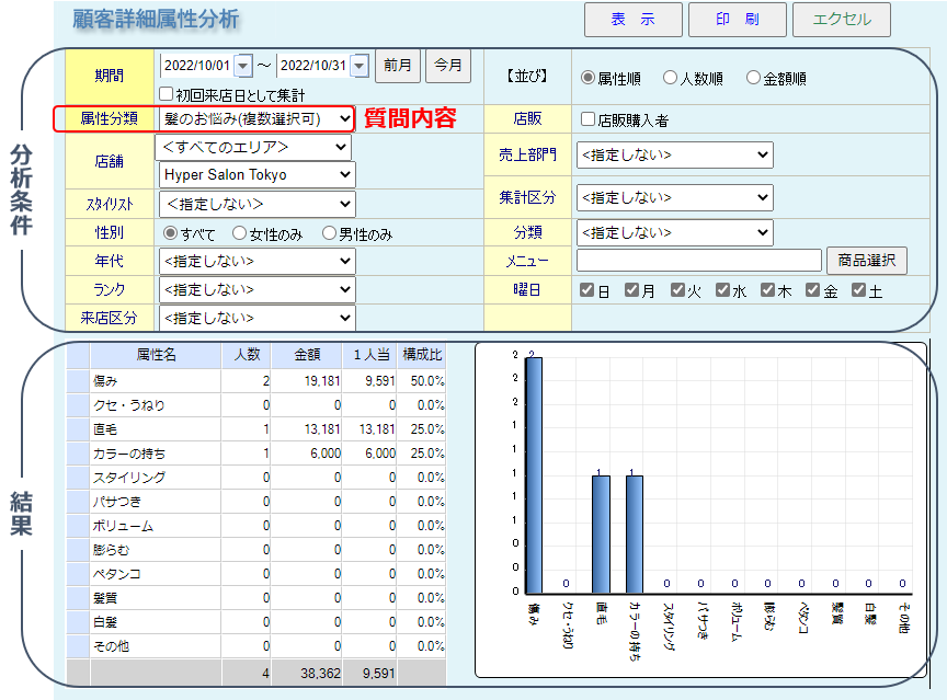 4. 「属性分類」から質問を選択し、質問の回答別でお客様の売上構成などが確認できます。